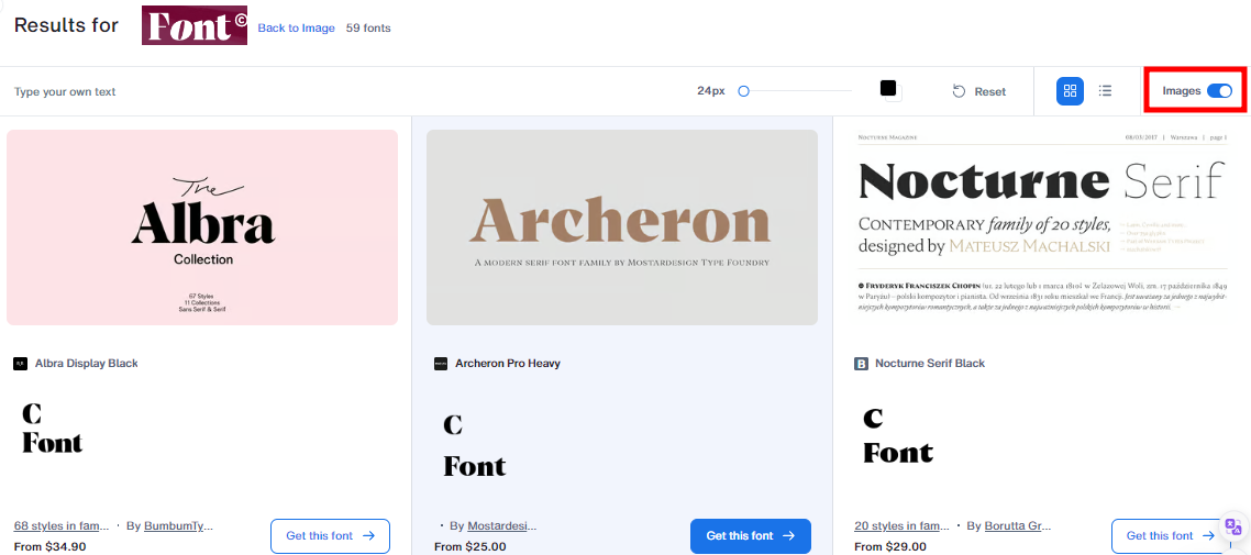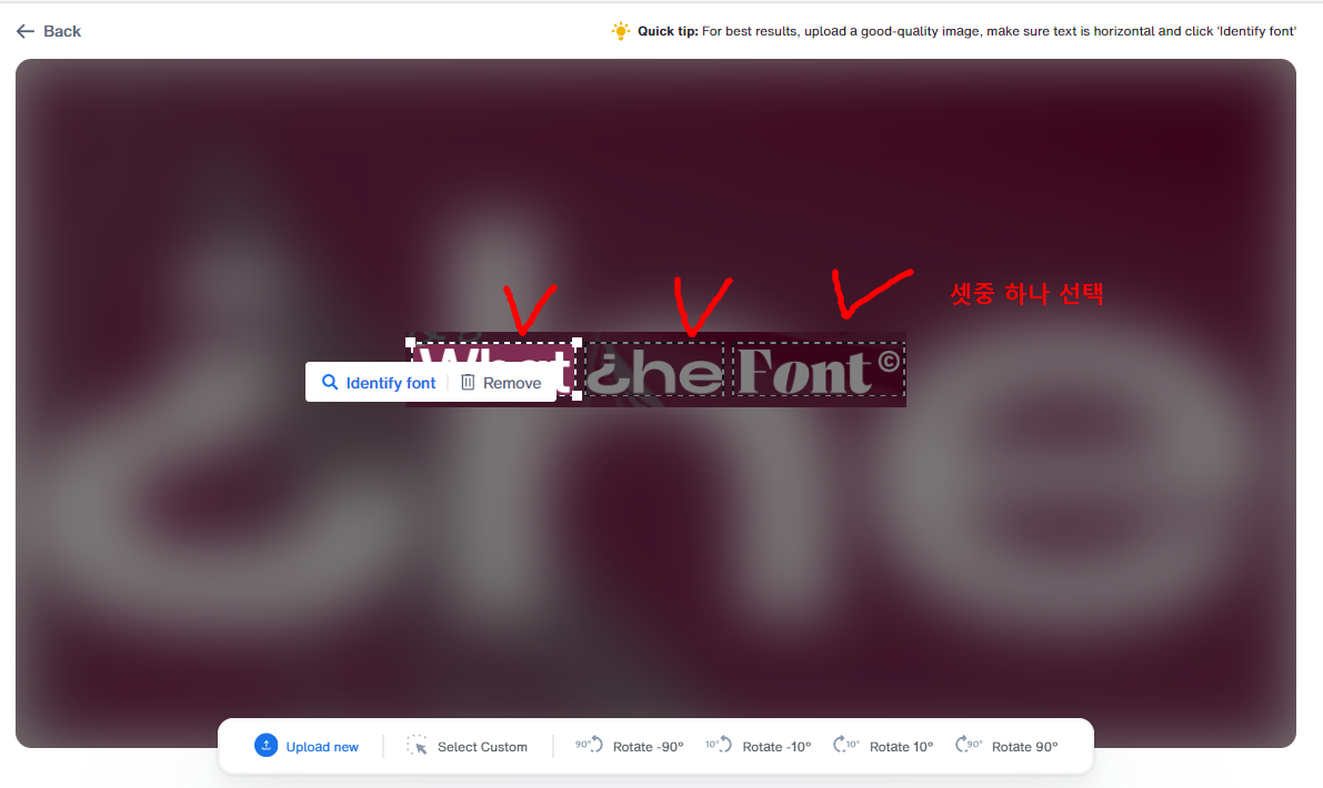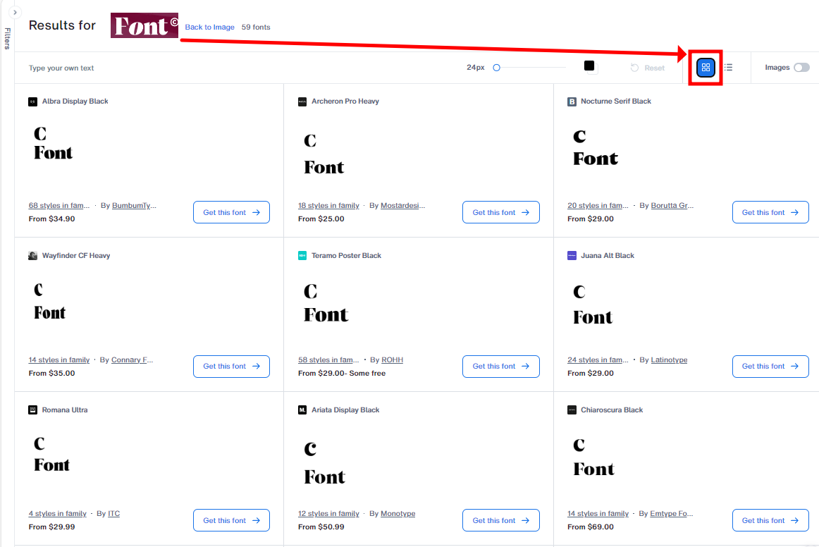 저는 "Font"라는 글씨의 글꼴을 찾아보려고 Font 라는 글씨 선택 후 Identify 클릭했어요. 2.4 찾은 결과를 한눈에 훑어 보기 편하게 바둑판 모양으로 설정했어요.