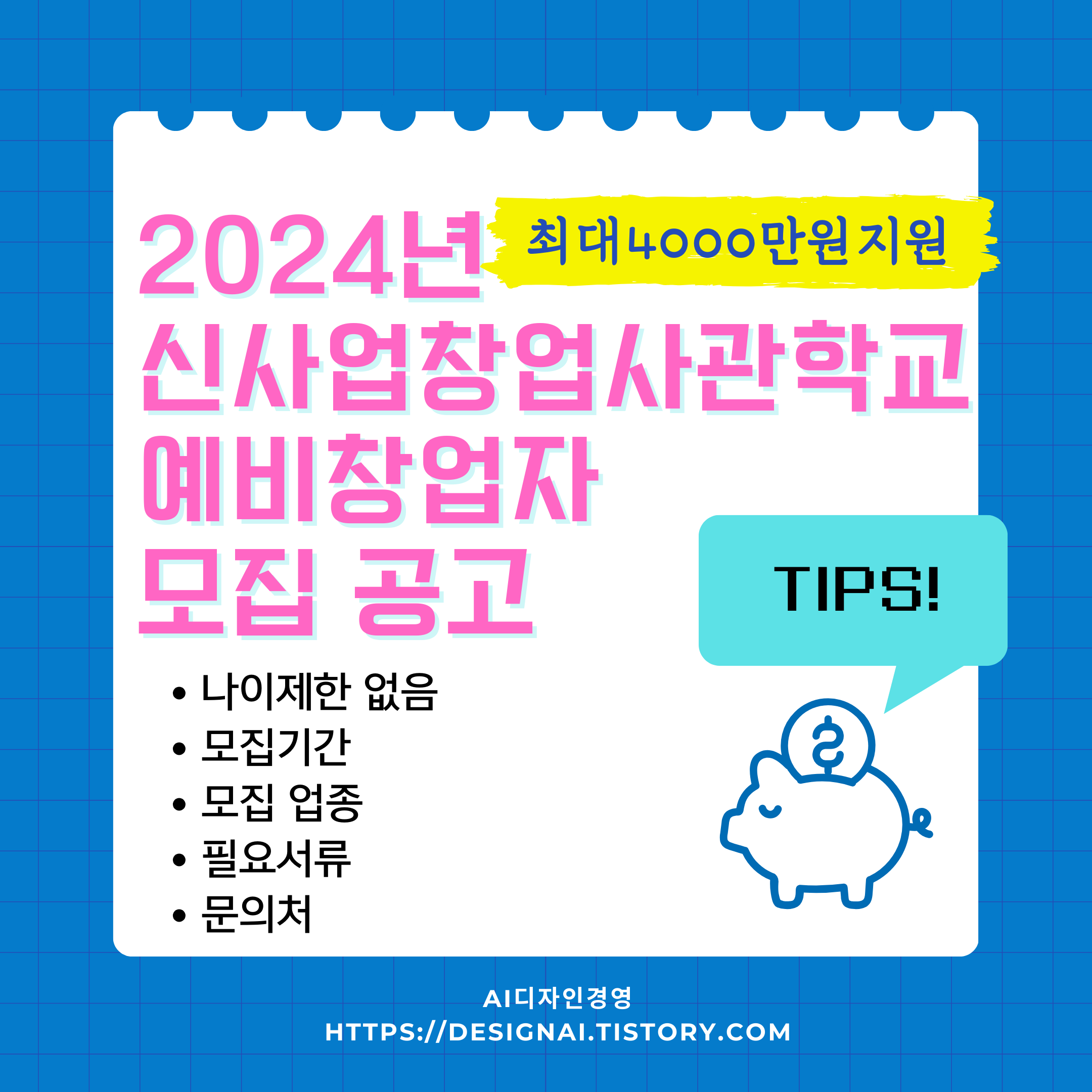 2024년 신사업창업사관학교 예비창업자 모집 공고 지원대상, 지원금, 신청방법, 신청기간카테고리 없음 2024. 3. 7. 10:08728x90