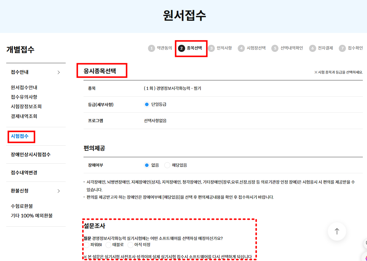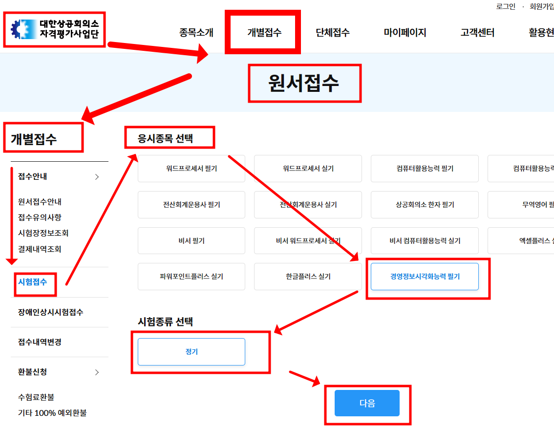상단의 개별접수->시험접수->응시종목선택