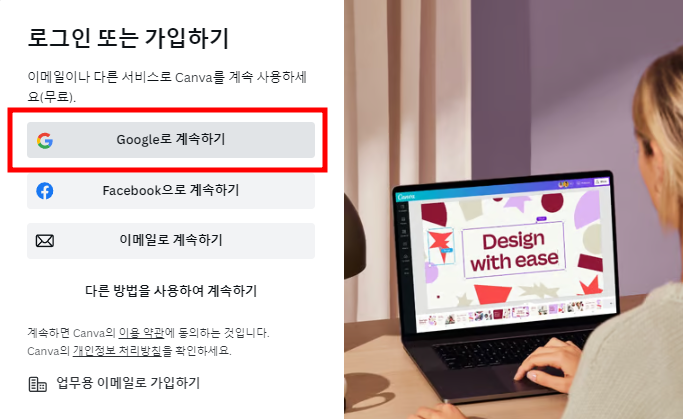 7)이어서 로그인 또는 가입하기 화면이 나오면 가급적 Google로 계속하기 를 선택해주세요.