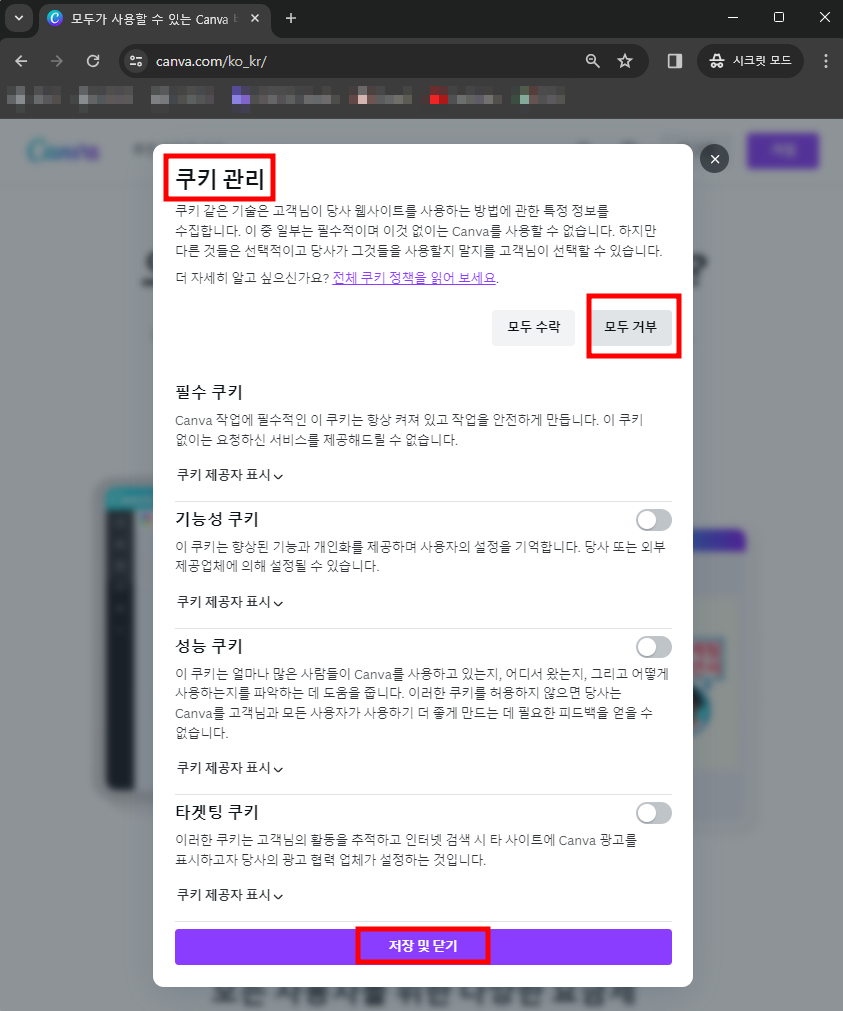 저는 시크릿모드여서 검정색 화면이예요. 3)아직 로그인 안한 상태에서 가장 하단의 쿠키관리를 클릭합니다.