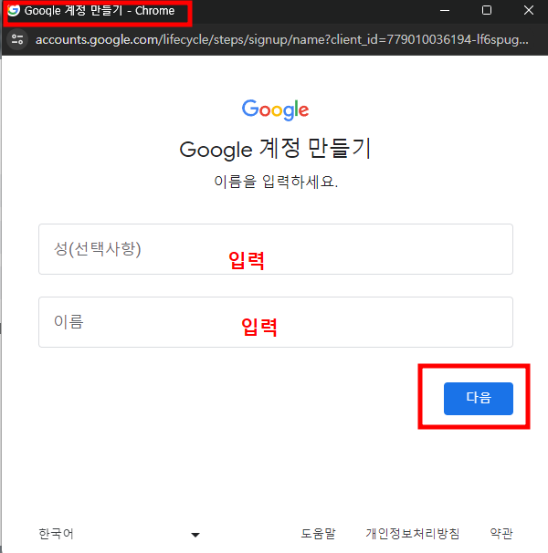 7-2)구글계정 만들기 : 이어지는 다음 화면들에 작성후 다음버튼클릭해가며 계정을 만들어주세요.