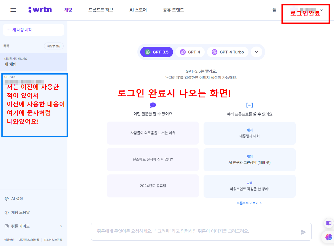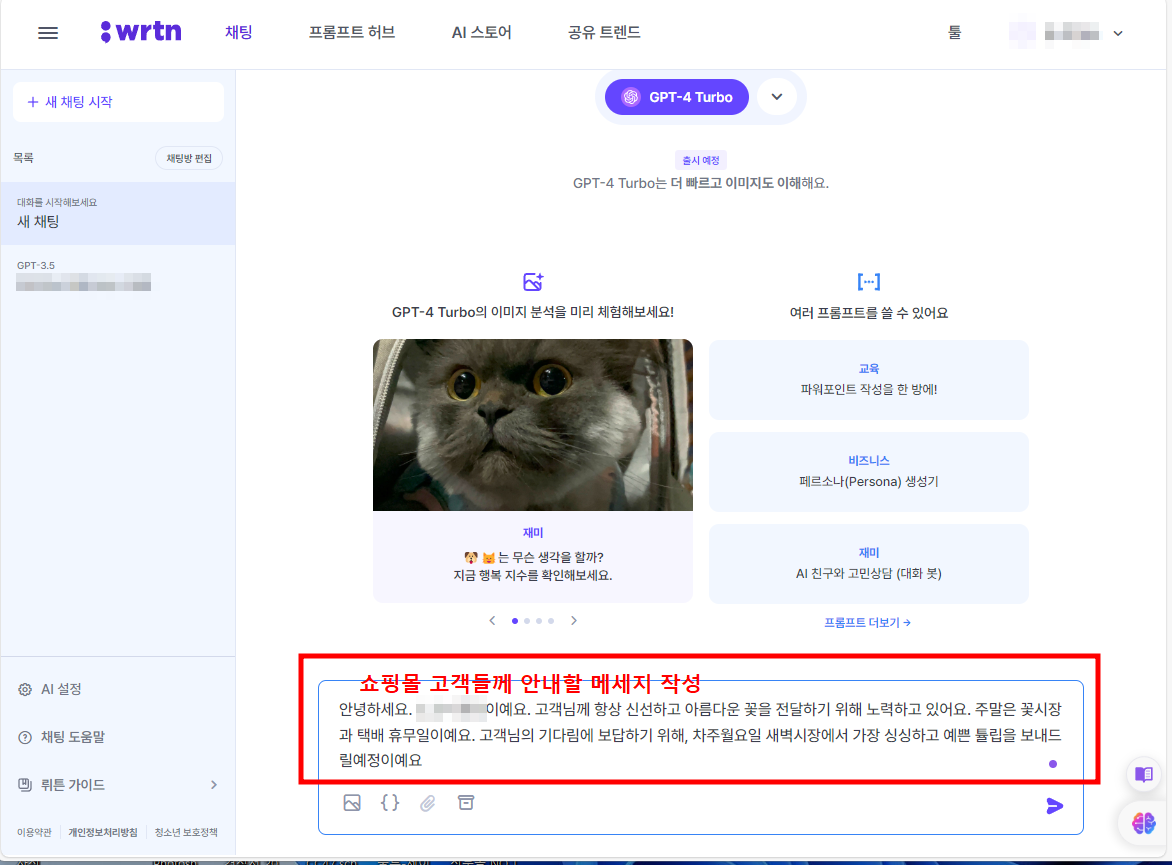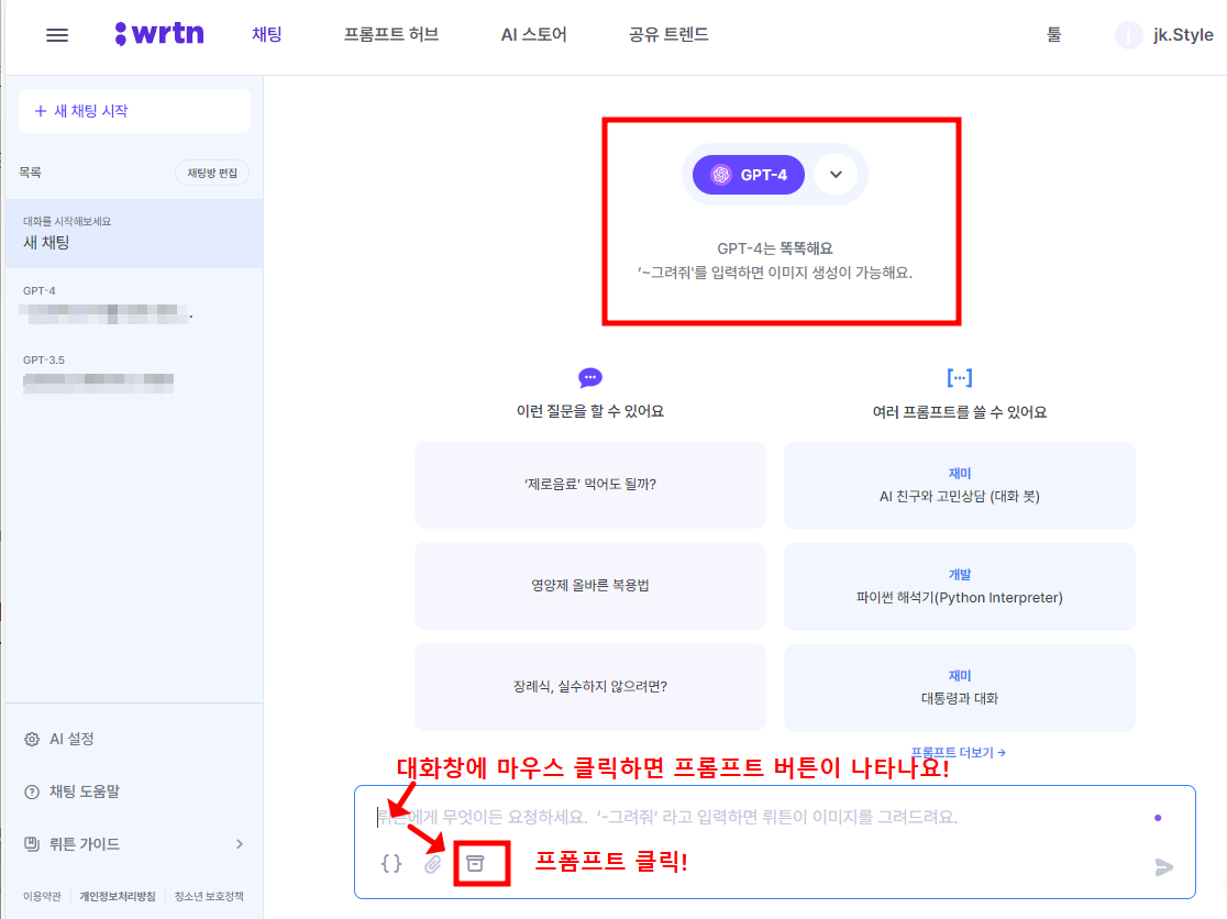 4) 현재 뤼튼에서사용 가능한 Ai 중 가장 똑똑한 GPT-4 선택 후 , 하단의 프롬프트 클릭