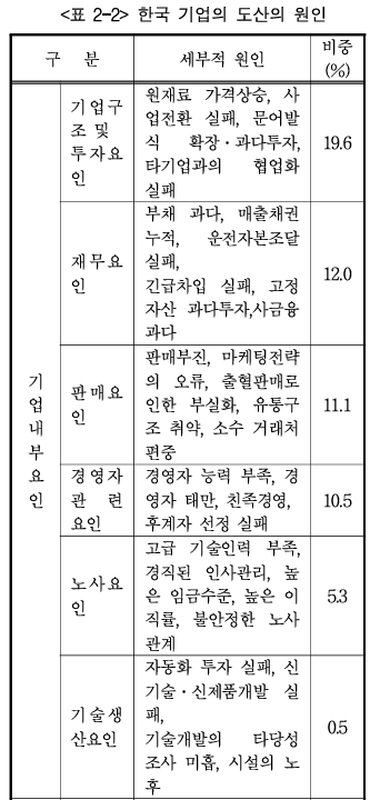 비효율적 인경영-> 매출부진->수익성저하->운전자금부족->자금조달능력부족->도산 - 한국기업의도산의 원인:
